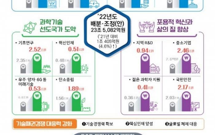 내년도 주요 R&D 예산 규모가 올해 대비 4.6% 증가한 23조 5000억 원 규모로 확정됐다.정부는 경제 회복, 선도국가 도약, 포용적 혁신을 위한 주요 국정과제 완수와 글로벌 기술패권 경쟁에 대응한