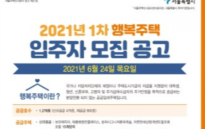 서울주택도시공사(SH공사, 사장 직무대행 황상하)가 행복주택 1천278세대를 공급한다.행복주택은 청년과 신혼부부, 고령자 등에게 주변시세의 60∼80% 금액으로 공급하는 임대주택이다.대학생·청년의 경우 6년, 자녀가 있는 신혼부부의 경우 10년, 고령자의 경우 최대 2