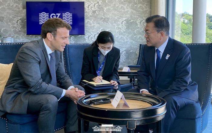 주요 7개국(G7) 정상회의 참석차 영국을 방문 중인 문재인 대통령은 13일 오전(현지시간) 카리스베이 정상회담 라운지에서 에마뉘엘 마크롱 프랑스 대통령과 ‘약식회담’을 했다.두 정상은 코로나19 방역 및 경제 상황을 공유했으며, 마크롱 대통령은 한국의 빠른 경제 회복