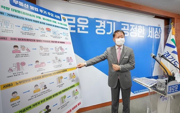 친인척 명의로 토지를 매입한 후 지분쪼개기 방식으로 부당이익을 취한 기획부동산과 지난해 과천지식정보타운 분양 아파트 부정청약자 등 불법 부동산투기자 178명이 경기도 단속에 덜미를 잡혔다. 이들이 얻은 불로소득은 1,434억 원에 달한다.김영수 경기도 공정특별사법경찰단