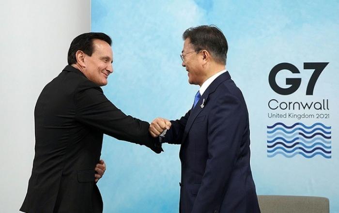 주요 7개국(G7) 정상회의 참석을 위해 영국을 방문 중인 문재인 대통령은 12일 오전(현지시간) 아스트라제네카사의 파스칼 소리오 글로벌 CEO를 면담했다.이 자리에서 문 대통령은 한국 국민의 보건증진뿐 아니라 기술이전과 생산 협력을 통해 한국이 세계적인 백신 허브로