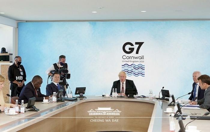 주요 7개국(G7) 정상회의에 참석 중인 문재인 대통령은 12일(현지시간) 보건을 주제로 한 초청국 정상 참여 첫 확대회의에서 백신의 공평한 접근권과 한국의 글로벌 백신 생산 허브로서의 역할을 강조했다.문 대통령은 이날 영국 콘월 카비스베이 호텔에서 열린 G7 정상회의