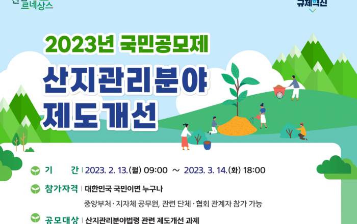 산림청은 산지 이용자의 불편을 덜고 산지관리정책에 국민의 의견을 반영하기 위해 오는 3월 14일까지 ‘산지관리분야 제도개선’ 국민공모를 실시한다. ‘산지 관리 분야 제도개선’ 공모제는 국민에게 불편을 주는 규제, 산지 개발 절차와 기준에
