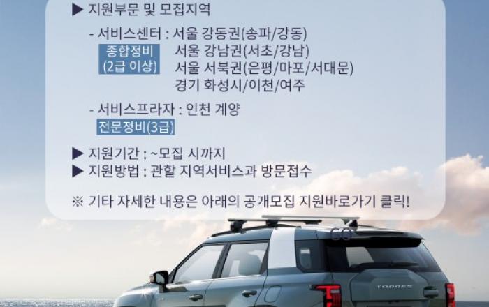 KG 모빌리티(이하 KGM)가 고객 서비스 강화를 위해 서비스 네트워크 확충에 나선다고 14일 밝혔다.이번 서비스네트워크 확충은 KGM이 애프터서비스(AS) 확장 및 고객 서비스 강화를 통해 고객에게 신속·정확한 서비스를 제공하기 위해 서비스센터와 서비스프라자 운영자를
