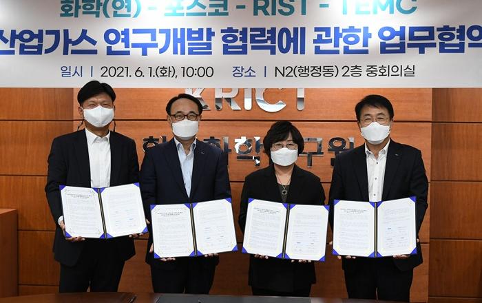 포스코가 친환경 산업가스 개발과 사업화를 추진하며 신성장 동력을 본격적으로 육성한다.포스코는 1일 대전 한국화학연구원 본원에서 유병옥 포스코 산업가스·수소사업부장, 이미혜 한국화학연구원장, 유성 RIST(포항산업과학연구원) 원장, 유원양 TEMC(티이엠씨) 대표 등이