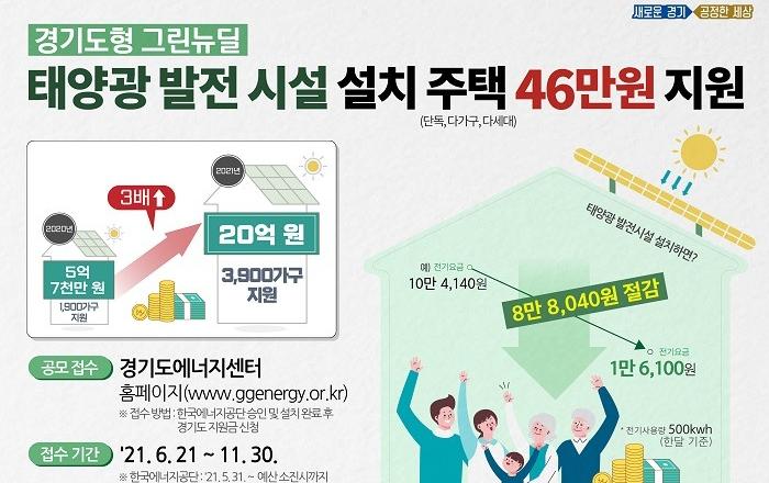 경기도가 주택 지붕이나 옥상에 태양광 발전기를 설치하기로 한 단독주택 3,900여 가구에 설치비 46만 원을 지원한다. 한국에너지공단의 지원금과 시․군별 보조금을 모두 합치면 해당 주민은 전체 설치비 460만 원 중 평균 92만 원을 부담하면 된다.24일 경기도에 따르