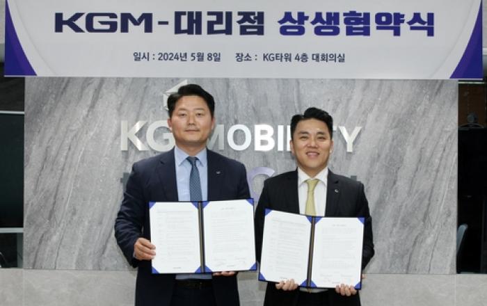 KG 모빌리티가 대리점협의회와 고객 만족도 향상을 위한 협력 사항을 점검하고 판매 활성화 방안을 모색하는 등 상생을 위한 'KGM-대리점 상생 협약식'을 체결했다고 9일 밝혔다. 지난 8일 서울 중구에 위치한 KGM 서울사무소에서 열린 상생 협약식에는 KGM 박경준