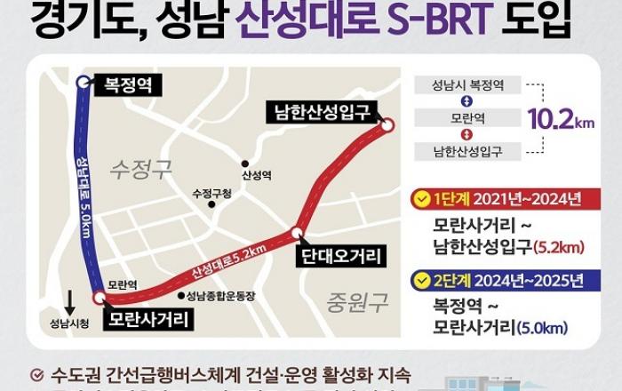 이르면 오는 2024년 중 경기도 성남시 산성대로에 ‘도로 위 지하철’로 불리는 ‘고급 간선급행버스체계(S-BRT)’가 도입될 전망이다.S-BRT(Super Bus Rapid Transit)는 기존 전용차로 운영 위주의 BRT에 전용도로, 전용차량, 우선신호 등의 시스