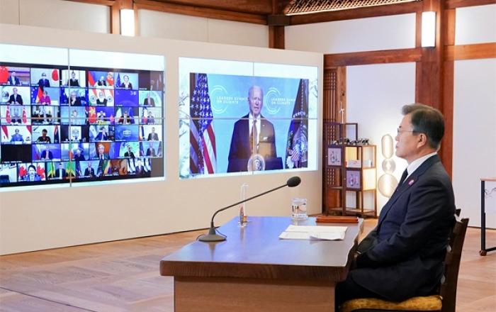 문재인 대통령은 22일 국가온실가스감축목표(NDC)를 추가로 상향하겠다고 선언했다.앞으로 새롭게 추진될 해외 석탄화력발전에 대한 공적 금융지원 중단 방침도 밝혔다.문 대통령은 이날 조 바이든 미국 대통령의 초청으로 열린 화상 기후정상회의 1세션에 참석해 이