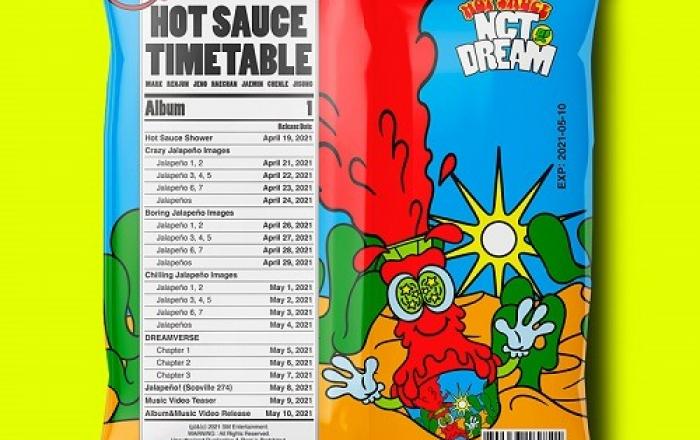 5월 10일 컴백하는 NCT DREAM(엔시티 드림)이 첫 정규 앨범 ‘맛 (Hot Sauce)’의 타임 테이블을 공개해 화제다.19일 0시 NCT DREAM 각종 SNS 계정을 통해 공개된 스낵 패키지 디자인의 첫 정규 앨범 ‘맛 (Hot Sauce)’ 타임 테이블에