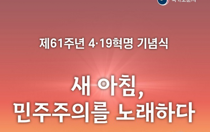 ‘새 아침, 민주주의를 노래하다’는 주제로 4·19혁명 제61주년 기념식이 19일 열린다.국가보훈처는 1960년 민중의 비폭력 저항으로 대한민국 민주주의 싹을 틔운 시민혁명인 4·19혁명 제61주년 기념식을 이날 오전 10시 서울 강북구 국립4·19민주묘지에서 개최한다