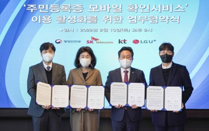 행정안전부는 2월 10일(목) 서울시 중구 SKT타워에서 SK텔레콤, 케이티, LG유플러스와 함께‘주민등록증 모바일 확인서비스’의 보안성 강화 및 이용 활성화를 위한 업무협약(MOU)을 체결한다고 밝혔다.‘주민등록증 모바일 확인서비스’는 실물 주민등록증 없이도 주민등록