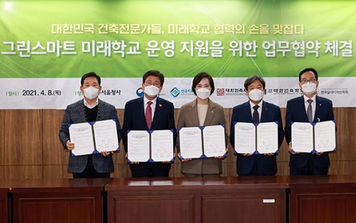 정부와 대한민국 건축전문가들이 미래학교 조성에 손을 맞잡고 교육 대전환의 디딤돌이 될 ‘그린스마트 미래학교’ 사업 추진에 협력하기로 했다.교육부는 8일 정부서울청사에서 ‘그린스마트 미래학교 사업 협력을 위한 건축 분야 업무협약’을 체결했다고 밝혔다.▲ 지난 8일 유은혜
