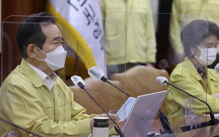 정세균 국무총리는 4일 “이번주에도 (코로나19) 확산세가 꺾이지 않는다면, 좀 더 강도 높은 방역대책을 검토해야 할 수도 있다”고 밝혔다. 이날 코로나19 대응 중앙재난안전대책본부 회의를 주재한 정 총리는 “코로나19 하루 확진자 수가 500명대로