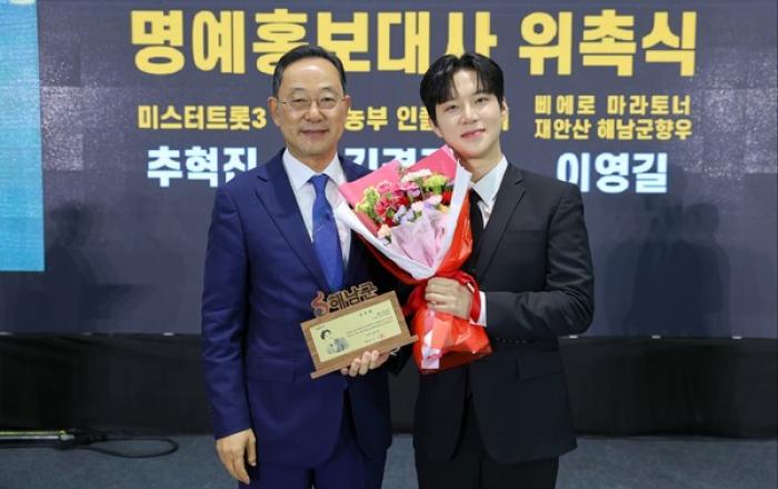'미스터트롯3' 가수 추혁진이 해남군 홍보대사로 위촉됐다. 추혁진은 지난 1일 해남군(군수 명현관)이 개최한 제52회 해남군민의 날 기념행사에 참석해 위촉패를 받고 해남군 홍보대사로 위촉됐다. 해남은 추혁진과 인연이 깊은 지역으로, 그의 아버지가 해남군 현산면 조산