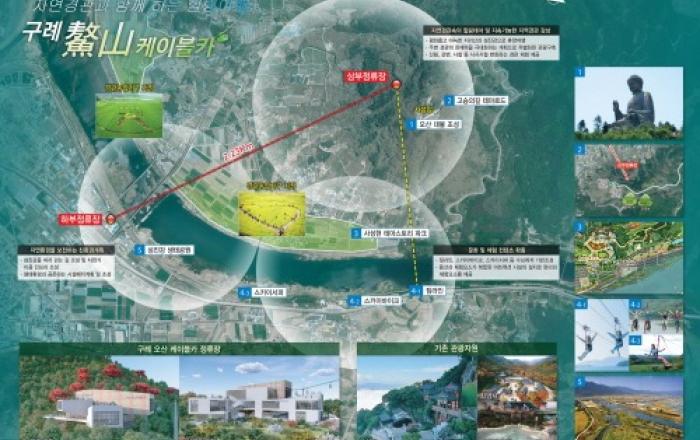 전남 구례군은 문척면 오산권역에 오산케이블카를 비롯한 2천억 원 규모의 민·관 합작 관광 프로젝트를 추진한다.군은 28일 대원플러스그룹과 구례 오산케이블카 설치사업 실시협약을 체결했다.군은 지난달 18일 구례 오산케이블카 설치사업 민간사업자 선정 심의위원회로 개최해 대