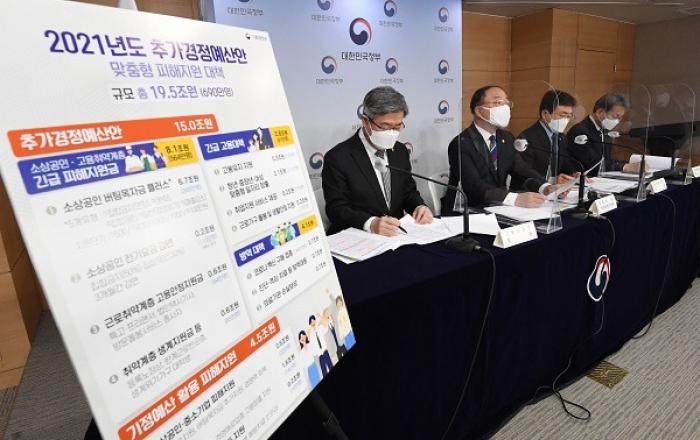 정부가 코로나19 피해가 집중된 소상공인 지원과 일자리 창출 등에 19조 5000억원을 투입해 690만 명을 지원하기로 했다. 이를 위해 15조 원의 추가경정예산안(맞춤형 피해지원 대책)을 편성했다.초유의 고용 위기 상황에서 가장 큰 타격을 입은 청년과 여성,