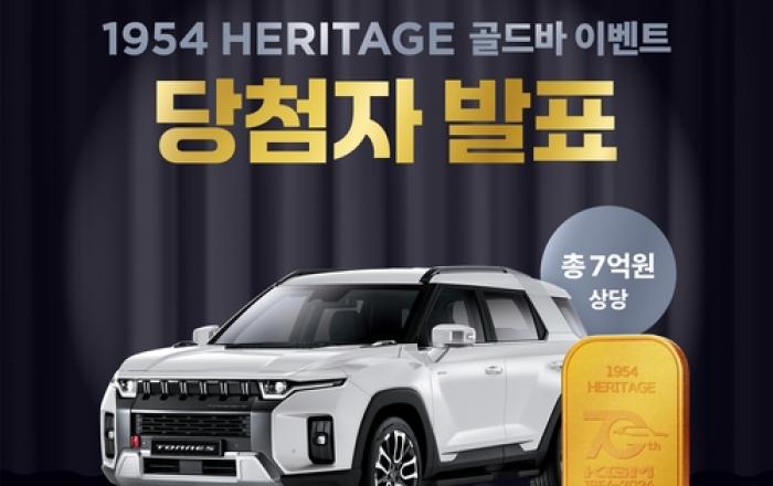 KG 모빌리티(www.kg-mobility.com, 이하 KGM)가 창립 70주년 기념으로 진행하는 1954 헤리티지 골드바 증정 이벤트 당첨자를 생방송으로 추첨한다고 16일 밝혔다. 1954 헤리티지 골드바 증정 이벤트는 1954년부터 이어온 KGM의 창립 70주