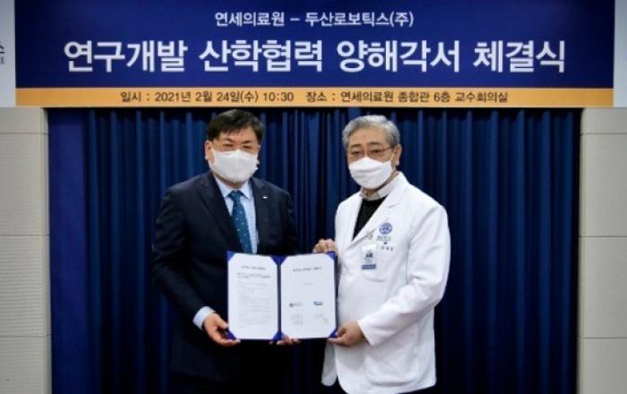 두산로보틱스가 연세의료원과 업무협약(MOU)을 맺고, 의료로봇 시장에 진출한다.24일 서울시 연세의료원 본원에서 열린 이날 협약식에는 윤동섭 연세대 의무부총장 겸 의료원장, 민병소 연세대 세브란스병원 로봇내시경수술센터 소장, 최동휘 두산로보틱스 대표 등이 참석했다.두산