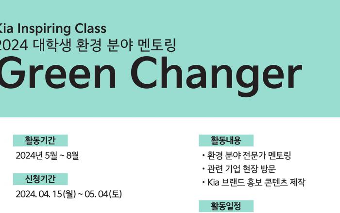 기아가 전국 대학생을 대상으로 진행하는 『기아 인스파이어링 클래스 – 그린체인저』 모집을 4월 15일(월)부터 5월 4일(토)까지 진행한다. ‘그린체인저’는 기아가 미래세대 육성을 위해 진행하는 사회공헌활동 ‘기아 인스파이어링 클래스(Kia Ins