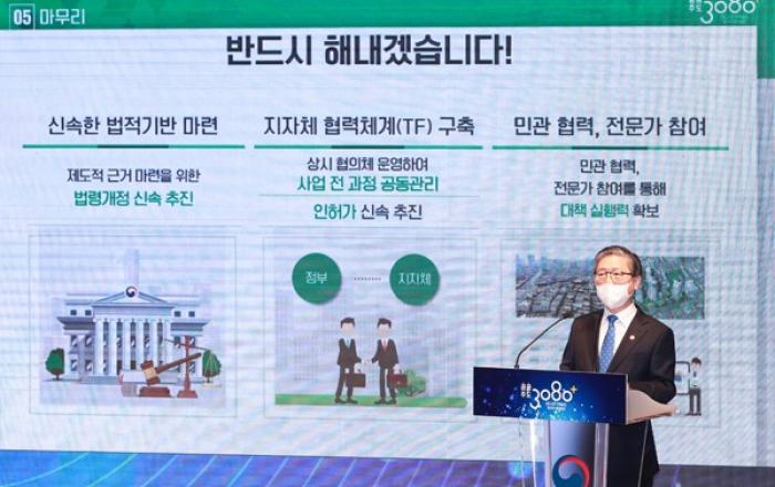 변창흠 국토교통부 장관은 “불안심리 해소를 위해서는 추가적인 주택공급이 절실한 상황”이라며 “2025년까지 서울 32만 가구 등 전국 80만 가구 이상을 추가로 공급하겠다”고 밝혔다.변 장관은 4일 정부서울청사에서 ‘공공주도 3080+ 대도시권 주택공급 획기적 확대방안