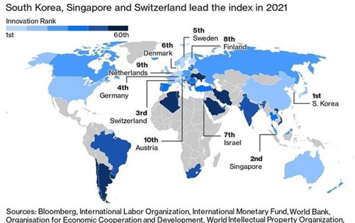 한국이 ‘2021년 블룸버그 혁신지수’ 세계 1위를 차지했다. 3일 기획재정부에 따르면 블룸버그가 이날 발표한 2021년 블룸버그 혁신지수에서 우리나라는 90.49점으로 60개국 중 1위를 차지하며 전년보다 한단계 순위 상승했다고