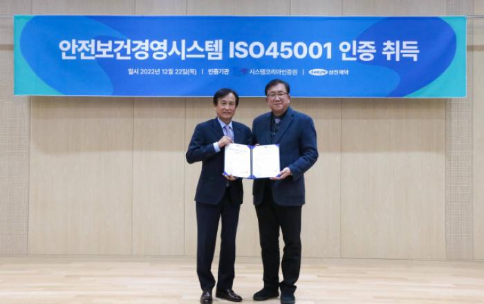 삼진제약이 국제 표준 ‘ISO 45001(산업 보건 및 안전 관리 경영시스템)’의 공식 인증기관인 시스템코리아인증원으로부터 오송공장에 대한 ‘안전보건경영시스템 인증’을 받았다고 23일 밝혔다.ISO 45001은 ‘국제표준화기구(ISO)’와 ‘국제노동기구(ILO)’가 2