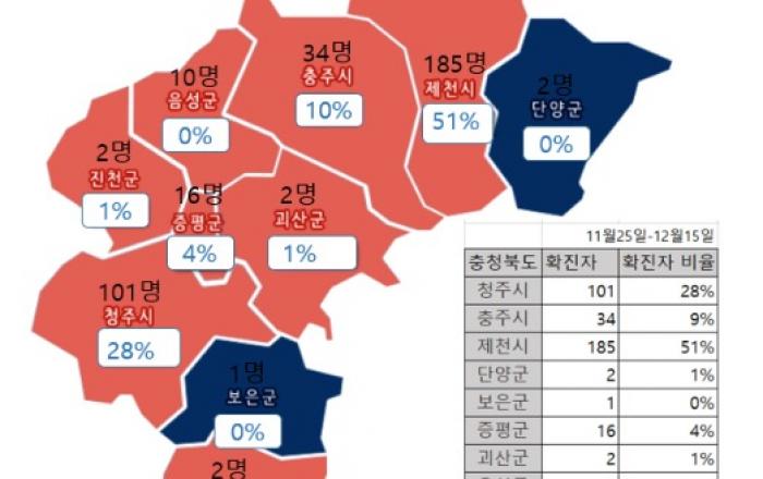 ▲ 11월25-12월15일 까지 충청북도내 코로나19 확진자 발생 현황 비교JD News 이용희 기자 = 지난달 25일 부터 이달 15일까지 충청북도에 코로나 바이러감염증(코로나19) 확진자가 제천에서 가장 많이 나오며 인근 지자체에 민폐끼치고 있다.제천은