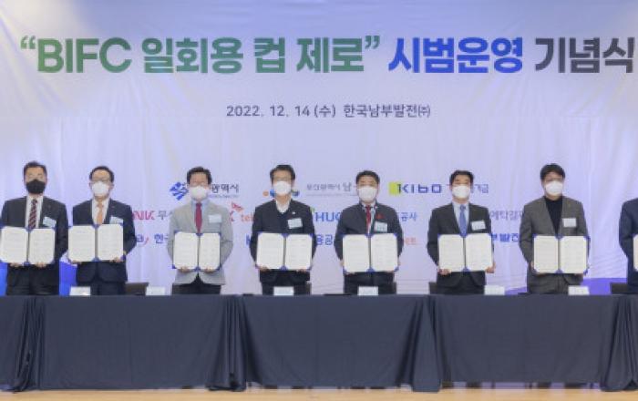 SK텔레콤은 부산광역시와 부산남구청 그리고 부산국제금융센터(BIFC)에 입주해 있는 7개 기관과 함께 ‘일회용 컵 제로 BIFC 시범운영’ 협약을 체결했다고 15일 밝혔다. 부산국제금융센터(BIFC)에 입주한 기관은 남부발전, 자산관리공사, 주택도시보증공사, 주택금융공