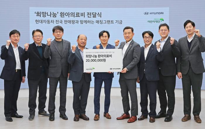 현대자동차가 역대 판매왕 등 전국 판매 우수 카마스터들과 함께 저소득층 환아들을 돕기 위한 후원금을 조성하고, 초록우산어린이재단에 전달했다.현대자동차는 9일(금) 영동대로사옥에서 정원대 현대자동차 국내지원사업부장, 이진원 현대자동차 국내사업지원실장, 최진성 현대자동차