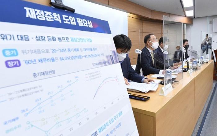 정부가 2025년부터 국가채무비율 기준을 60%, 통합재정수지는 -3% 이내로 관리하기로 했다.단 코로나19처럼 심각한 국가 재난이나 경제위기 발생시에는 예외를 두기로 했다. 홍남기 부총리 겸 기획재정부 장관은 5일 정부세종청사에서 이같은 내용을 담은 한국형 재정준칙