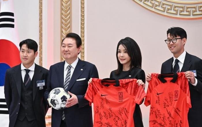 윤석열 대통령은 8일 2022 카타르 월드컵 축구 국가대표팀을 청와대 영빈관으로 초청해 환영 만찬을 가졌다. 이날 만찬에는 주장 손흥민 선수를 비롯한 21명의 태극전사와 파울루 벤투 감독 등 코치진, 현장에서 선수들의 건강과 영양을 책임진 지원 인력 등이 참석했다