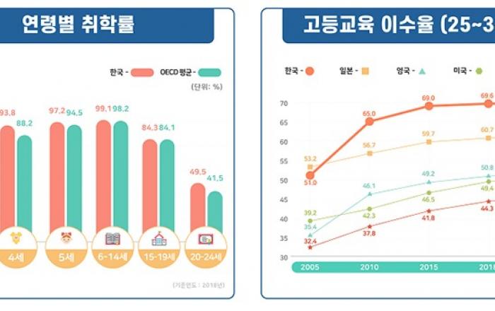 우리나라 만 3∼5세 취학률이 OECD 국가의 평균보다 크게 높은 것으로 나타났다.또 청년층의 고등교육 이수율은 OECD 국가 중 2위를 차지했으며, 교육단계별 상대적 임금 격차도 전년에 비해 감소했다. 중학교 및 고등학교 교사 1인당 학생 수는 감소했으나 학급당 학생