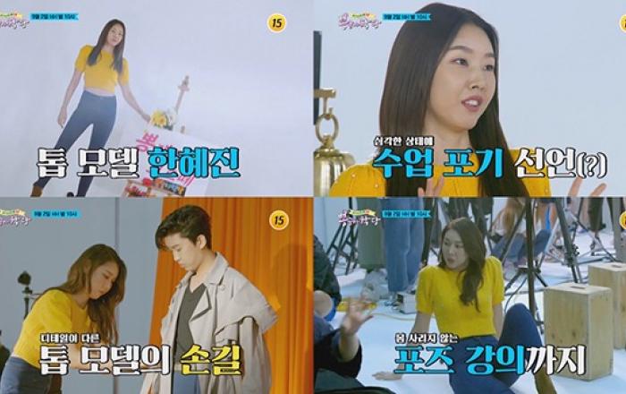 톱모델 한혜진이 TV조선 ‘뽕숭아학당’에 출연해 화보 촬영에 도전하는 트롯맨 F4 임영웅, 영탁, 이찬원, 장민호를 위한 모델 수업을 진행한다.공개된 예고편 속 한혜진은 F4를 위해 런웨이 시범을 보였고 이어 런웨이에 도전한 트롯맨들의 워킹 실력을 보자마자 수업 포기를