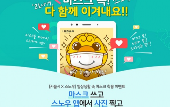 서울시가 코로나19 재확산을 막기 위해 마스크 착용의 중요성을 강조하는 ‘마스크 꼭 다 함께 이겨내요 시민참여 캠페인’을 펼친다.이번 캠페인은 인기 카메라 앱인 ‘스노우(SNOW)’와 함께 오는 9월 2일부터 22일까지 진행한다. 스노우 앱에서 마스크 착용을 독려하는
