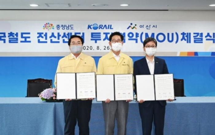 한국철도가 26일 오전 충청남도청에서 충청남도, 아산시와 함께 ‘한국철도 전산센터(이하 철도전산센터) 투자협약’을 체결했다고 밝혔다. 세 기관은 한국판 뉴딜 중점과제로 선정된 첨단 전산센터 건립에 힘을 모으기로 했다.철도전산센터는 승차권 발매, 열차운행 등 철도관련 전