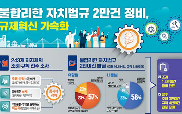 정부가 243개 지자체의 조례·규칙을 전수 조사해 총 2만여건의 불합리한 자치법규를 발굴한 결과, 조례 1만 3000여건을 정비했고 3800여건의 규칙은 9월부터 집중 정비를 추진할 계획이다. 정부는 20일 정세균 국무총리 주재로 정부세종청사에서 열린 제11