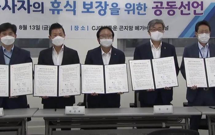 고용노동부는 한국통합물류협회, CJ대한통운㈜·㈜한진·㈜롯데글로벌로지스·㈜로젠 등 주요 택배사와 함께 13일 택배 종사자의 휴식 보장을 위한 공동의 노력사항을 발표했다. 이번 공동선언은 코로나19로 인한 물량 급증에 따라 택배기사를 비롯한 종사자의 건강 악화 우려가 있
