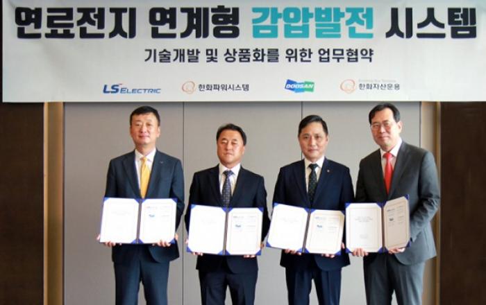 두산퓨얼셀은 LS일렉트릭, 한화파워시스템, 한화자산운용과 ‘연료전지 연계형 감압발전 시스템 기술개발 및 상품화를 위한 업무협약’을 체결했다고 13일 밝혔다.이번 협약은 그린뉴딜 정책에 부응하는 것으로, 도시가스 정압시설에서 버려지는 에너지 재활용을 위한 에너지 전문 기