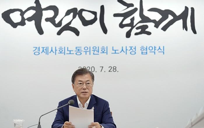 문재인 대통령은 28일 경제사회노동위원회(경사노위)가 의결한 ‘코로나19 위기 극복을 위한 노사정 협약’에 대해 “서로 조금씩 고통을 분담해 이룬 합의가 기업과 일자리를 지키면서 빠른 경제 회복은 물론 경제적 불평등 해소에도 큰 도움이 되리라 확신한다”고 말했다. ▲