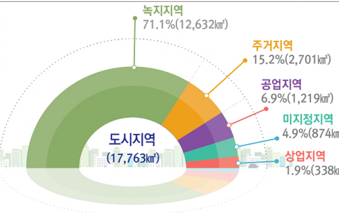 우리나라 국토의 16.7%를 차지하는 도시지역에 총인구의 91.8%가 거주하고 있는 것으로 조사됐다. 국토교통부와 한국토지주택공사는 지난해 기준 도시지역 인구와 면적 등 현황이 수록된 ‘2019년 도시계획현황 통계’를 20일 발표했다. ‘국토의 계획 및