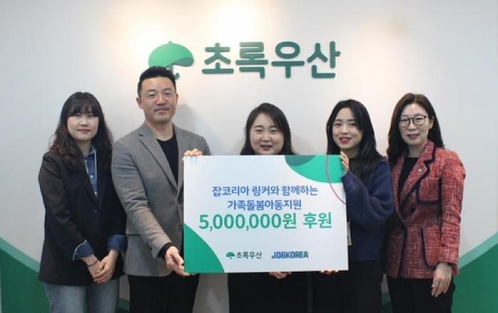 잡코리아는 지난 23일 초록우산에 '가족돌봄아동' 후원금 500만원을 전달했다고 29일 밝혔다. 이날 후원금 전달식은 초록우산 서울지역본부에서 신홍섭 잡코리아 피플실 이사, 한영은·김하영·황진아 잡코리아 문화추진단, 신정원 초록우산 사회공헌협력본부 본부장이 참석한