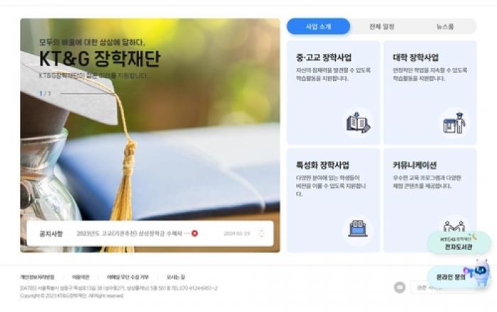 KT&G장학재단이 전면 리뉴얼한 새로운 홈페이지를 공개했다. 이번에 공개된 새로운 홈페이지(scholarship.ktngtogether.com)에서는 KT&G장학재단의 방향성과 사업별 세부내용을 한눈에 볼 수 있도록 '모두의 배움에 대한 상상에 답하다'라는 슬로건과