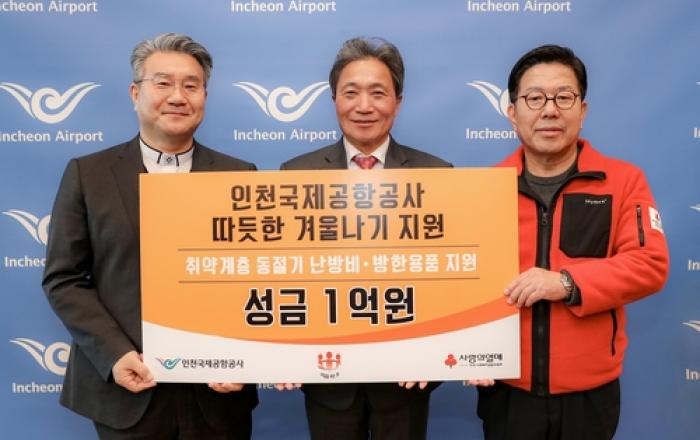 인천국제공항공사는 18일 인천사회복지공동모금회 및 (사)인천내일을여는집에 지역 취약계층 방한용품 및 난방비 지원을 위한 사회공헌성금 1억원을 전달했다고 밝혔다. 이날 오전 공사 회의실에서 열린 성금 전달식에는 인천국제공항공사 이학재 사장, 인천사회복지공동모금회 조상