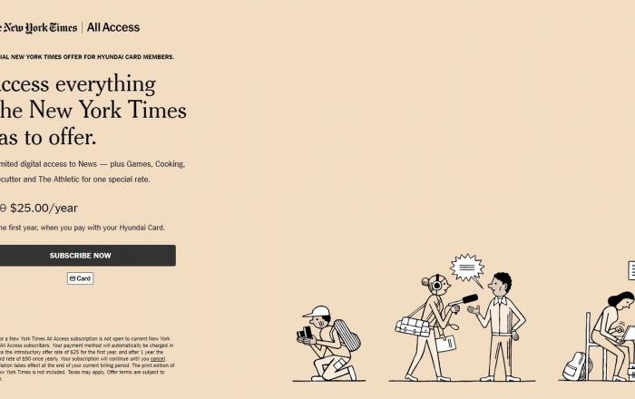 현대카드가 미국의 유력 일간지 뉴욕타임스(The New York Times)와 손잡고 현대카드의 데이터 사이언스 기반 마케팅을 통해 뉴욕타임스의 디지털 구독 서비스를 추천하고 공동 콘텐츠 프로젝트를 기획하는 등의 내용을 담은 제휴를 맺었다고 15일 밝혔다.먼저 현대카드