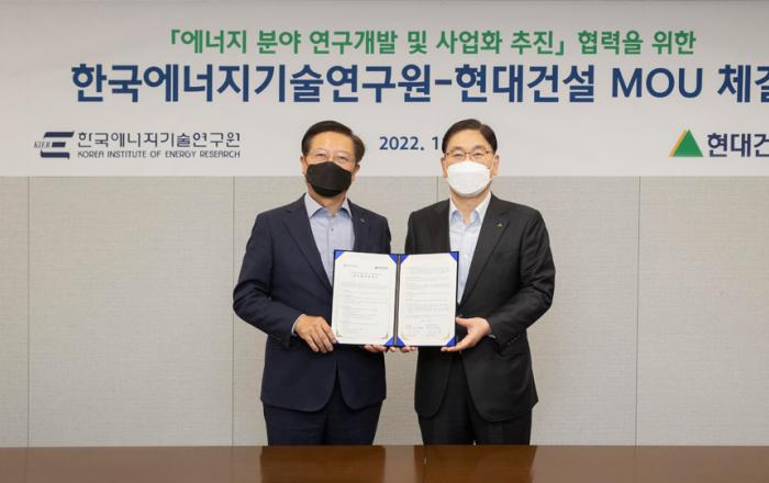 현대건설과 한국에너지기술연구원은 18일(金), 탄소중립 실현을 위한 ‘에너지 분야 기술개발 협력 및 사업화 추진을 위한 업무협약(MOU)’을 체결했다.서울시 종로구에 위치한 현대건설 본사에서 열린 이날 서명식은 현대건설 윤영준 사장과 한국에너지기술연구원 김종남 원장 등