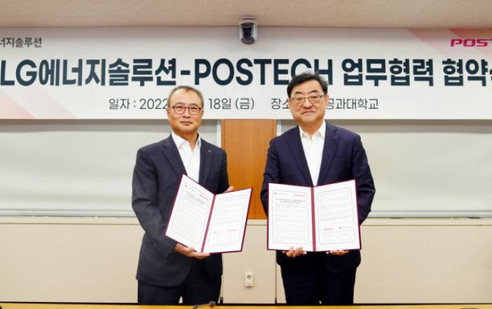 LG에너지솔루션과 POSTECH(포항공과대학교)가 배터리 소재 및 공정 기술 개발을 위해 산학 공동 협력 체계를 마련하기로 했다.18일 LG에너지솔루션과 POSTECH은 ‘LG에너지솔루션-포항공과대학교 간 상호 협력에 관한 업무 협약(MOU)’을 체결했다고 밝혔다. 이
