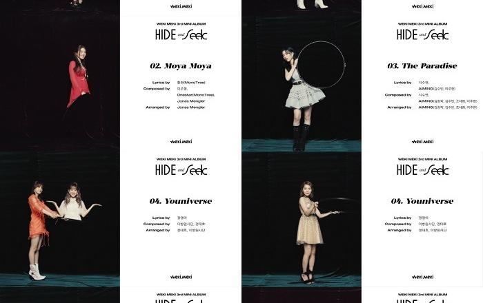 그룹 위키미키(Weki Meki)가 13일 세 번째 미니앨범 ‘HIDE and SEEK’(하이드 앤 식)의 하이라이트 메들리로 앨범 전곡을 미리 공개하며 컴백 기대감을 높였다.위키미키의 SNS 채널에 게재된 하이라이트 메들리는 앨범명 ‘HIDE and SEEK’의 뜻인