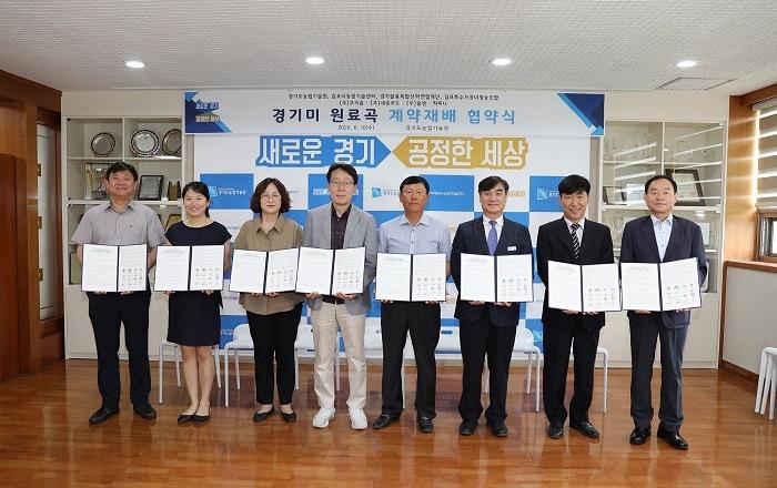 경기도농업기술원과 경기쌀융복합산학연협력단이 10일 도내 4개 쌀 가공업체와 경기미 안정적 수급, 소비 확대를 유도하기 위한 ‘경기미 원료곡 계약재배 협약식’을 열었다.화성 농업기술원 본관에서 열린 이 날 협약식에는 김석철 경기도농업기술원장과 기원종 김포특수가공미영농조합
