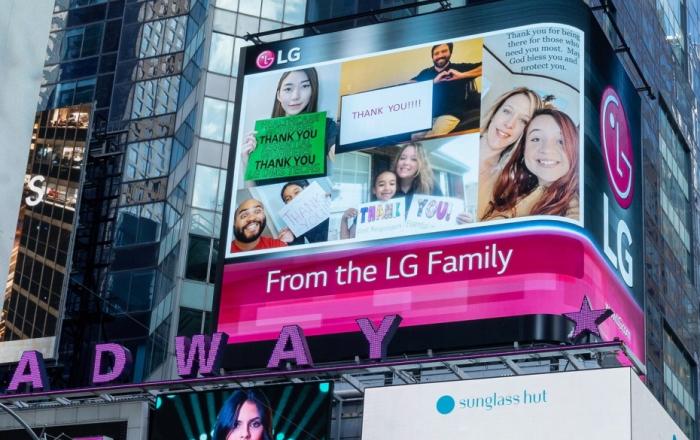 LG전자가 미국 뉴욕에서 코로나 19 극복을 위해 헌신하는 많은 분들에게 고마운 마음을 전하고 있다. LG전자는 미국 현지시간 4일부터 뉴욕 타임스스퀘어에 있는 LG전자 전광판에 미국법인 임직원들이 직접 만든 '땡큐 (Thank You)' 메시지를 보여주고 있다. 지난